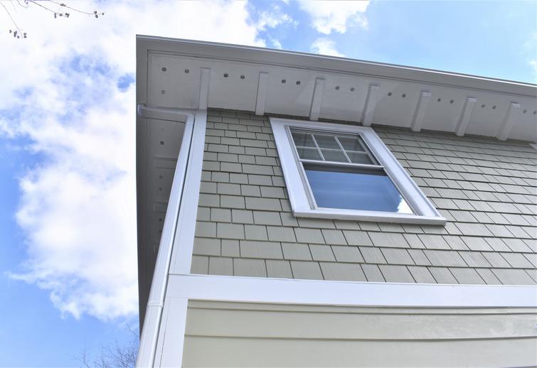 Here you see an image below the overhang of the roof. The original fascia and soffits were preserved to maintain the historic look of the home. Keeping some original features is a great way to keep the archiectural integrity of historic houses. Be sure to ask your siding contractor for color samples prior to placing an order. Place them on different sides of your home to see how the color appears on your property.